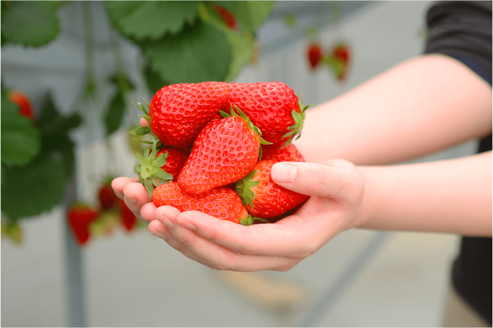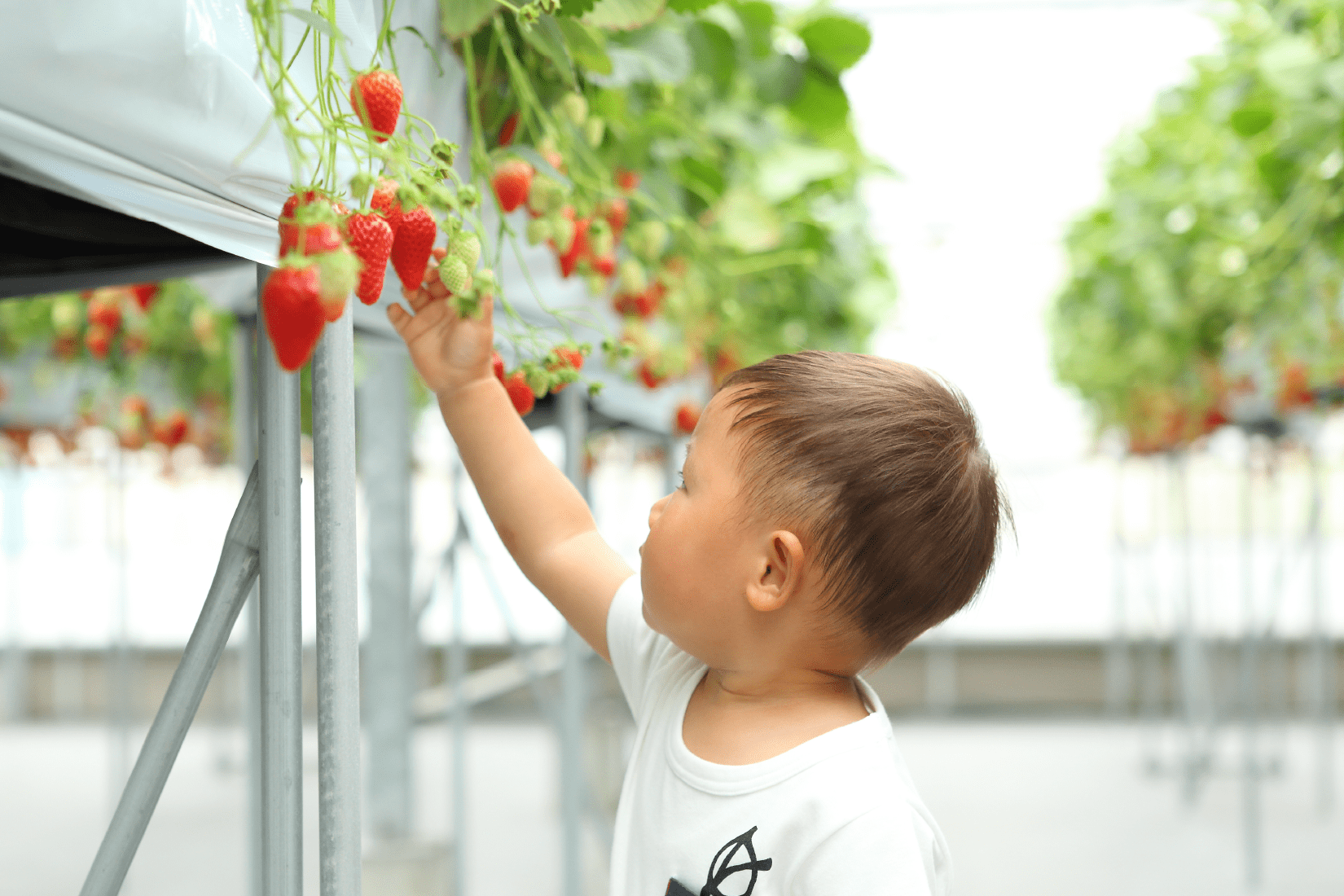 地上から1mほどの高さで栽培する「高設栽培」を採用してるため、腰を屈めなくてもいちごを楽に採ることができます。